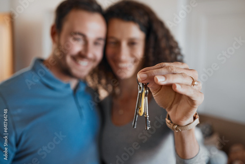 Hand, success or happy couple with house keys in real estate, property investment or buying apartment. New home blur, goal or excited man with smile or woman to celebrate moving in flat together