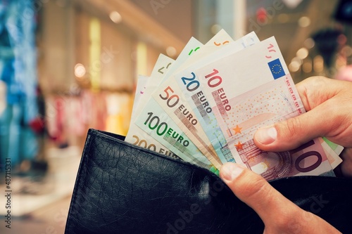 Hand taking out money from pocket wallet. Counting money, economy concept, money distribution