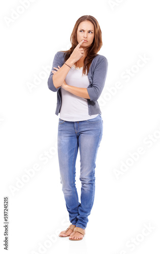 Hand, thinking and confused woman isolated on transparent, png background for choice, decision or choice. Casual person or model standing and thoughtful, contemplating or ideas