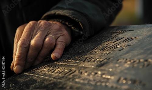 Hand touches engraved inscription on dark surface.