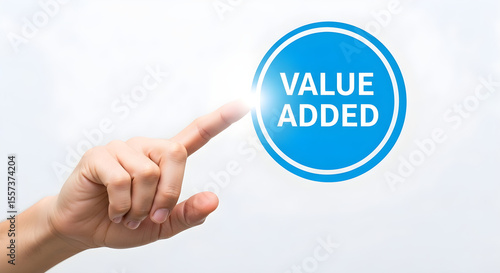 Hand touching a blue circle with value added text on a white background image on transparent background