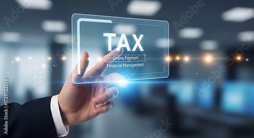 Hand touching a futuristic tax interface on a screen.