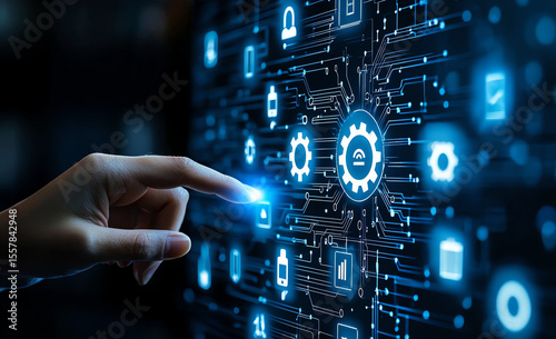 Hand touching gears icon on digital screen represents technology and innovation, showcasing interaction between human and machine in modern environment