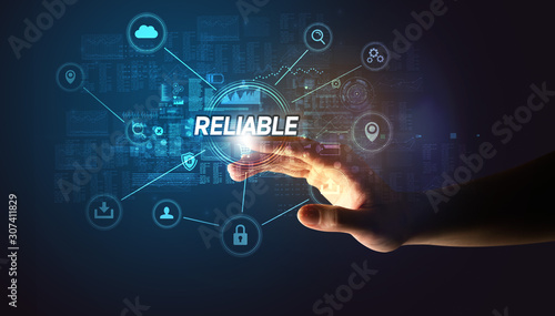 Hand touching RELIABLE inscription, Cybersecurity concept