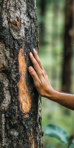 Hand touching tree bark in a lush forest, symbolizing nature connection and conservation.