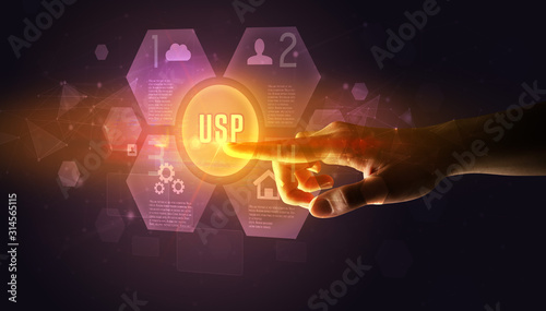 Hand touching USP inscription, new technology concept