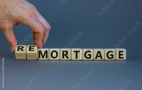 Hand turns cubes and changes the word 'remortgage' to 'mortgage' or vice versa. Beautiful grey background, copy space. Business concept.