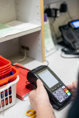 Hand using a handheld scanner in a workspace of a medical practice