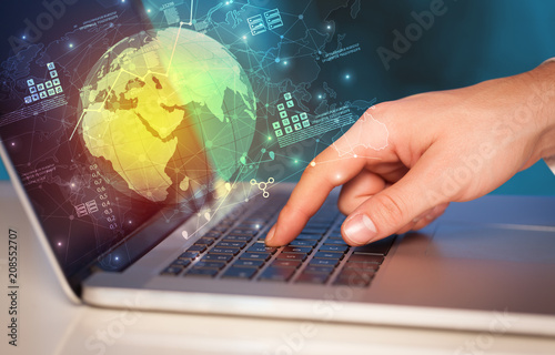 Hand using laptop with global reports and stock market change concept