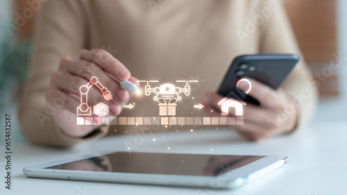 Hand using smart devices with icons of robotic packaging, drone delivery, and home shipping. Concept of automation, supply chain, and smart logistics system.