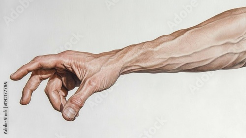 Hand with arm reaching out, isolated on white background. Photorealistic image of a male hand and wrist in profile, holding something or touching an object. The left palm is extended forward, fingers