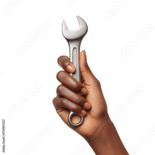Hand with Dark Skin Holding a Silver Wrench Tool (Transparent PNG)
