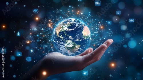 Hand with Earth Surrounded by Technology Icons: A hand holding the Earth, surrounded by floating technology icons, symbolizing the digital world's impact on the planet.