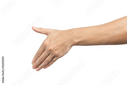 Hand with handshake gesture isolated on white background. Clipping path included. side view