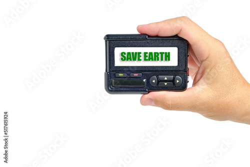 Hand with pager white background, inscription save earth.