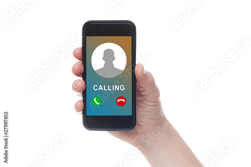 Hand with smartphone and unknown incoming phone call on it. Hand holding a smart phone and the phone ringing tube.