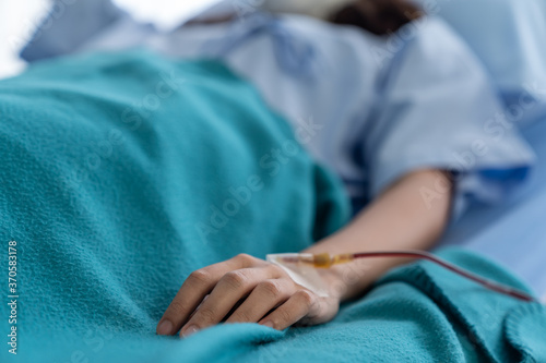 Hand woman with medical drip intravenous needle while lying on the ged at hospital.