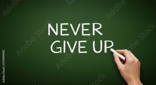 Hand writing motivational phrase "Never Give Up" on green chalkboard.