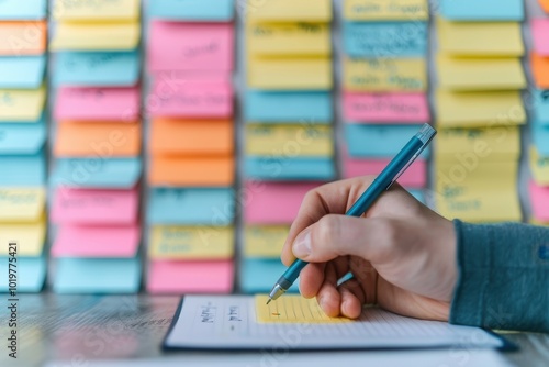 Hand writing notes with a pen in front of a wall covered with colorful sticky notes