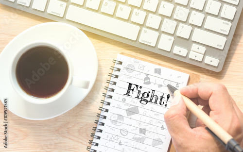 Hand writing on book message Fight. A keyboard and a glass coffee table.Vintage tone.