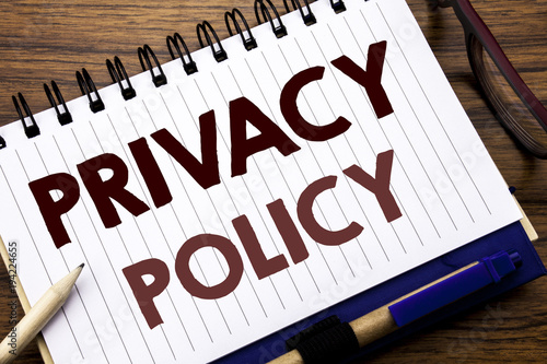 Hand writing text caption inspiration showing Privacy Policy. Business concept for Safety Data Rules Written on notebook note paper, wooden background with glasses pen and marker.