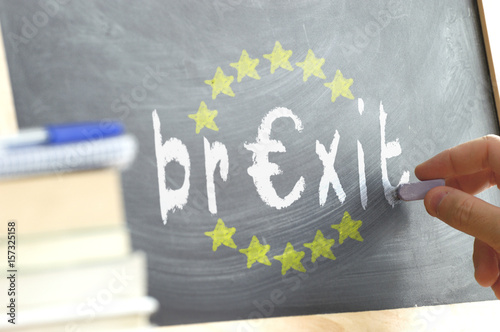 Hand writing the word BREXIT with the euro symbol in a Economics class. Eleven stars representing the European Union. Euroscepticism concept.