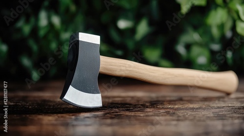 Handcrafted axe on wood, green foliage background
