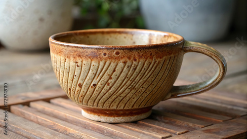 Handcrafted Ceramic Mug with Rustic Glaze A Cozy Aesthetic for Coffee or Tea Time Enjoyment and Natural Wood Table