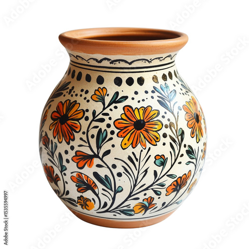 Handcrafted ceramic vase with colorful floral patterns and intricate designs. This decorative piece adds vibrant touch to any space, showcasing artistry and craftsmanship