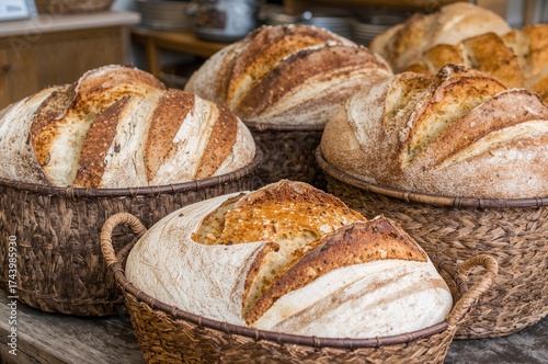 Handcrafted golden loaves with soft centers arranged in vintage wicker baskets at a charming bakery.