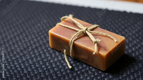 Handcrafted soap bar tied with natural twine on a textured dark surface background