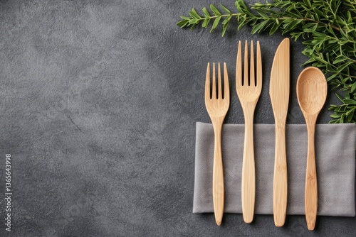 Handcrafted Utensils on Grey Napkin Surrounded by Greenery