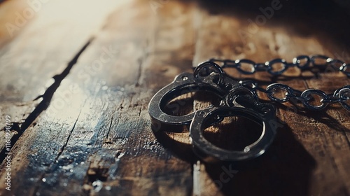 Handcuffs resting on a wooden table with a blurred background, symbolizing restraint and the complexity of freedom and confinement.