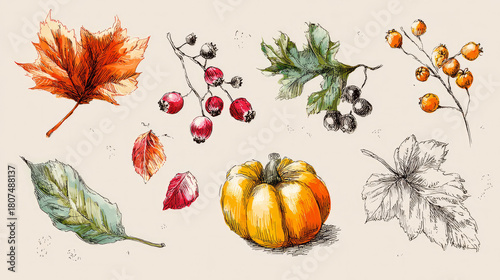 Hand-drawn autumnal collection: leaves, berries, pumpkin, and crayon