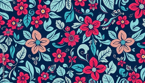 Hand-drawn batik floral seamless pattern, block print style, vector Leaves, flowers, swirls, empty space, print, nature