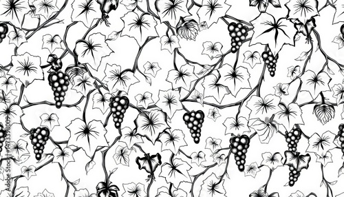Hand-drawn black and white grapevine seamless pattern with ample negative space, simple, elegant