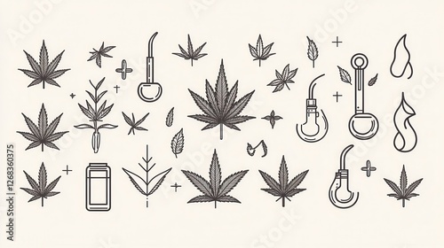 Hand-Drawn Cannabis Illustrations with Leaves and Tools Design
