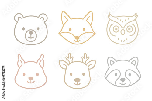 Hand-drawn cartoon faces of forest animals including raccoon, owl, and squirrel with light pastel outlines. Ideal for rustic branding and educational design.