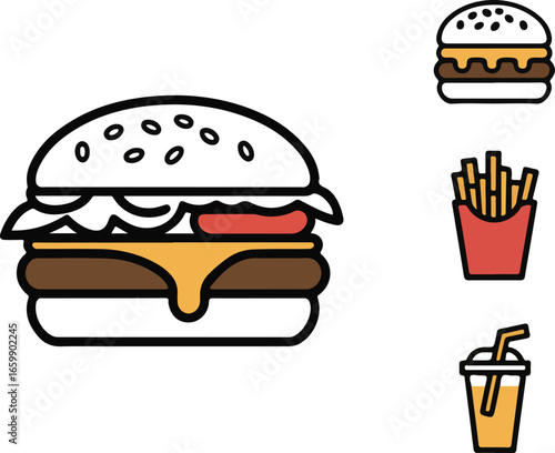 Hand-Drawn Cheeseburger Line Icons Set Burger with Fries, Soda Cup, Lettuce, Tomato, and Cheese Slice