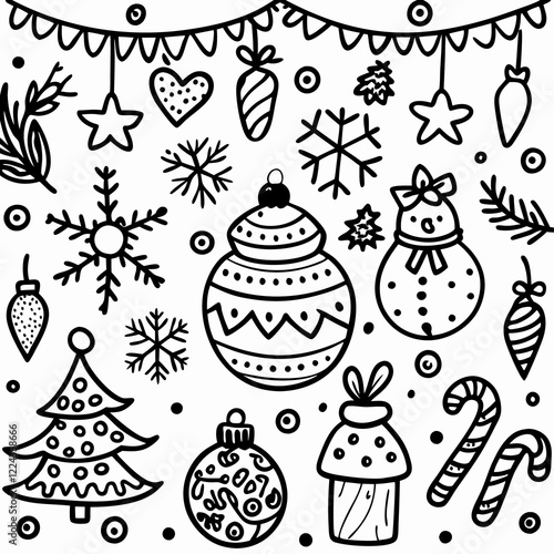 Hand-drawn Christmas decorations, ornaments, and winter elements.