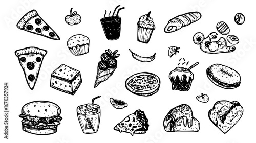 Hand-Drawn Collection of Various Delicious Foods and Drinks Featuring Desserts and Snacks