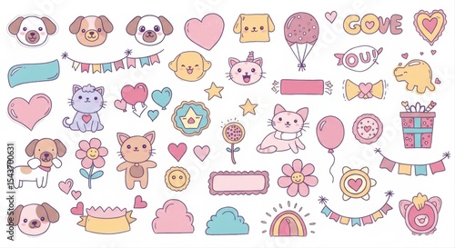 Hand-Drawn Cute and Playful Sticker Sheet with Animals, Hearts, and Festive Elements