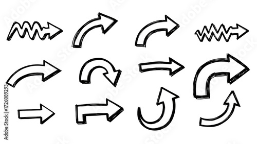 Hand-Drawn Doodle Arrows – Scribble Marker Style PNG Set (12 Icons) with Transparent Background