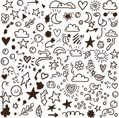 Hand-Drawn Doodle Collage with Celestial and Botanical Elements