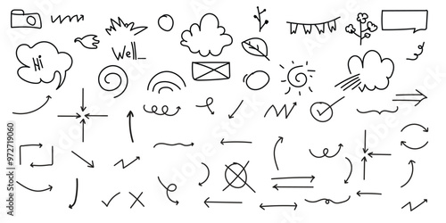 Hand-Drawn Doodle pen line elements Set Arrows, Speech Bubbles, Hearts, Stars, Swirls, anime mark and Decorative Lines for Design design for print