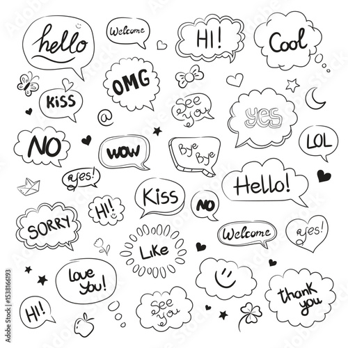 Hand-drawn doodle speech bubble vector icons set for text design and comic illustration