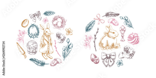 Hand-drawn Easter circle compositions with bunnies, eggs, flowers, and festive elements in vintage sketch style