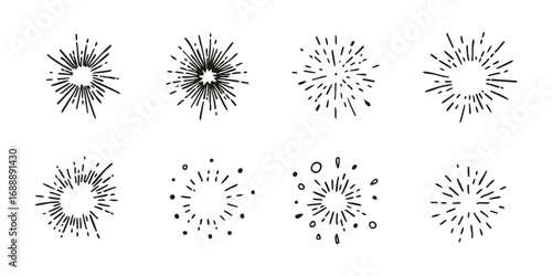 Hand-Drawn Fireworks Burst Set. Celebration And Festivity Elements Collection. Isolated Vector Illustration