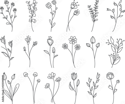 Hand-drawn floral line art; white background; design elements; various blossoms