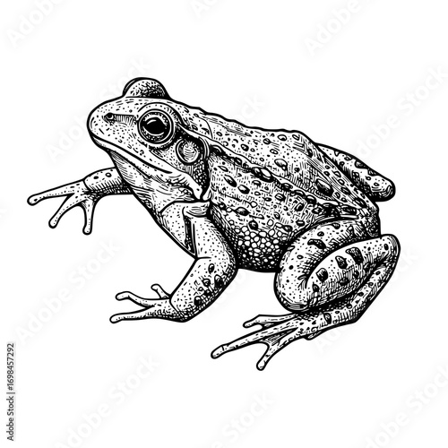 Hand-drawn frog vintage illustration in old engraving style, black sketch on white background, trendy wildlife print, unique amphibian art, retro nature artwork.